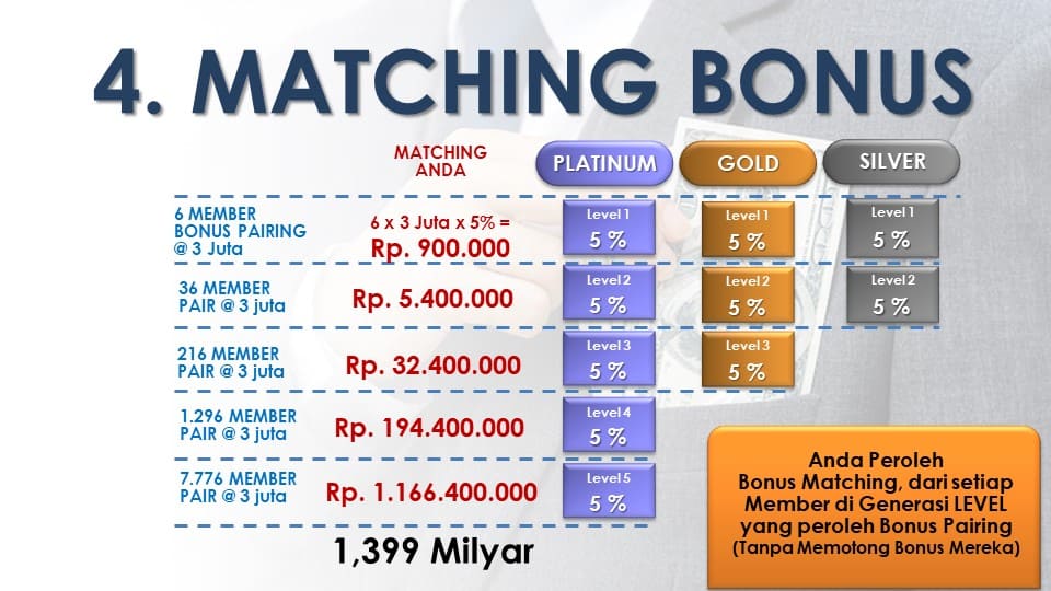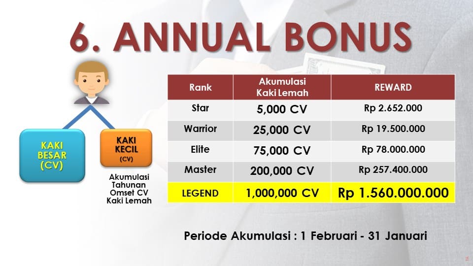 Peringkat bonus yang Anda dapatkan tergantung peringkat keanggotaan yang Anda pilih (berdasarkan total CV dari produk yang Anda beli) saat mendaftar menjadi Anggota.